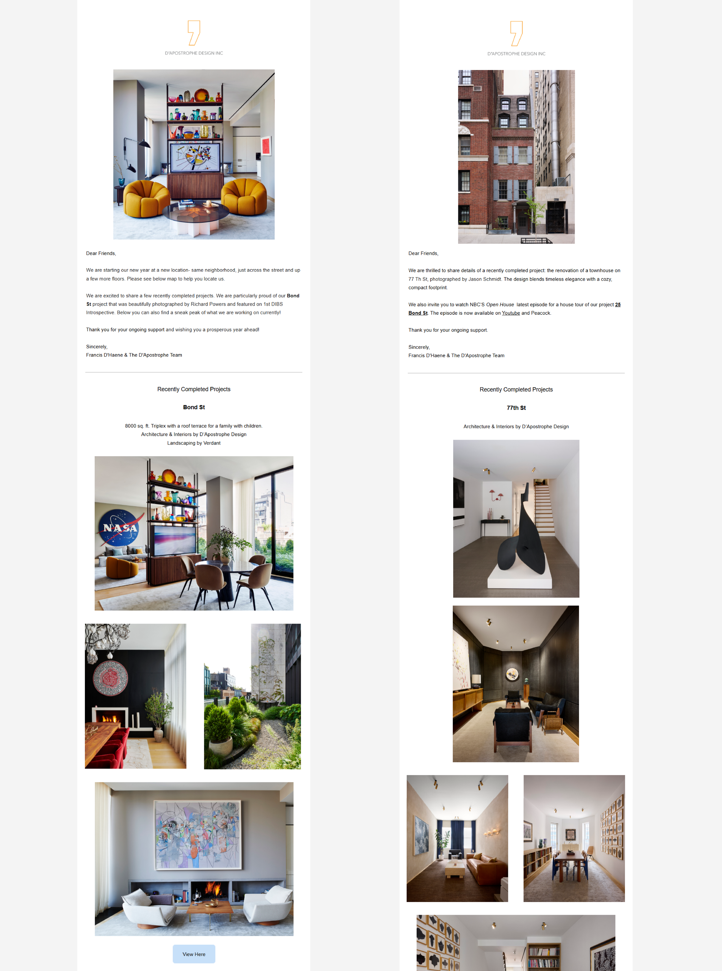 In parallel, I produced and distributed newsletter campaigns via Mailchimp to keep clients informed and drive traffic to featured projects.