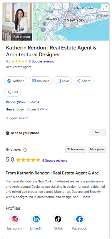 A Google Business Profile and presence across Instagram, TikTok, and Facebook serve as key channels for expanding Katherin's digital reach. I developed her social media strategy, advising on the creation of reels to highlight properties, including shooting style and posting frequency. The Google Business Profile was launched in March 2025; performance data is accumulating.